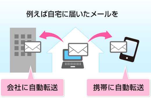 ご自宅のアドレスに届いたメールを、会社や出張先、携帯電話のメールアドレスなど、別のメールアドレスへ自動転送することができます。