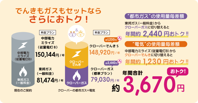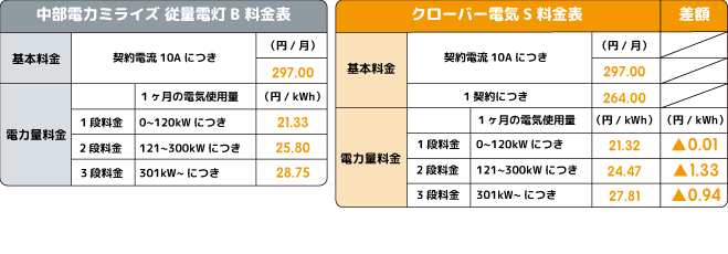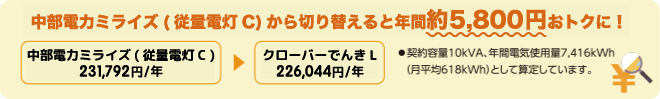 - ※クローバーでんきと中部電力従量電灯との比較になります。(消費税等相当額を含み、燃料費調整額、再生可能エネルギー発電促進賦課金は含みません。)