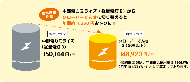 - ※クローバーでんきと中部電力従量電灯との比較になります。(消費税等相当額を含み、燃料費調整額、再生可能エネルギー発電促進賦課金は含みません。)