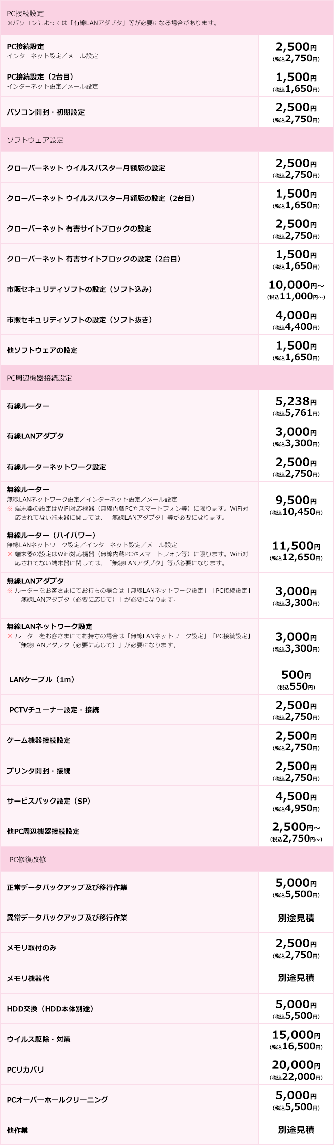 サポートについて 基本設定サービス パソコン有線接続1台分のメール設定・ブラウザ設定は専門業者が対応!すぐにインターネットができるように設定【無料】するので安心です。 ※ 当社指定の設定業者になります。その他の特別設定および機器等は有料にて承ります。 ※ 工事完了後に担当がご訪問いたします。 出張サポートサービス 解決までの流れ お電話しながら接続・操作などをしていただき解決いたします。 (例)メールが送れない、無線LANにしたい など お電話で問題が解決しない場合はご訪問させていただきます。 サポート専門スタッフがご訪問し、直接「お困りごと」を解決いたします。 有料サポートメニュー