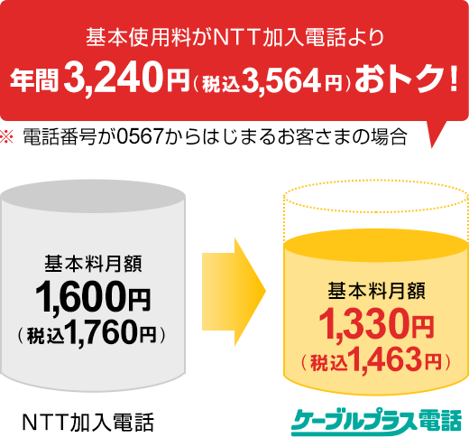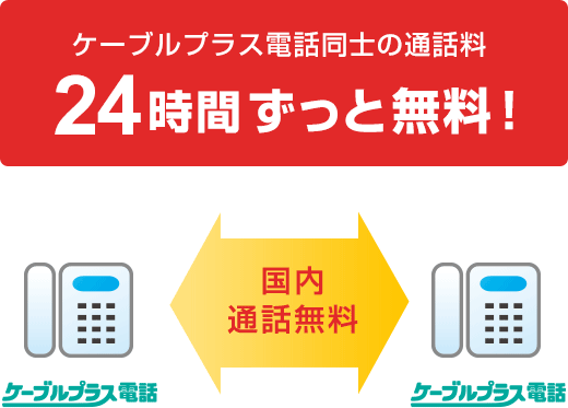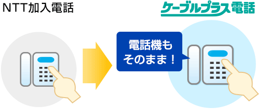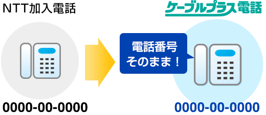 ケーブルプラス電話 電話料金がとってもおトク! NTT固定電話に比べ月額基本料がおトクに! 国内の一般加入電話にかける場合はもちろん、国際電話・携帯電話との通話料もグーンとおトク! 使い勝手やお支払いがとっても便利! 番号ポータビリティ(同番移行) ※1 NTT加入電話、INSネット64を休⽌してご利⽤の場合、NTT休⽌⼯事費2,000円(税込2,200円)がNTTよりお客様に請求されます。 ※2 一部電話番号を継続できない場合があります。 電話のかけ方や受け方は今までと同じ! ※1 一部使用できない機種があります。 ※1 一部使用できない機種があります。