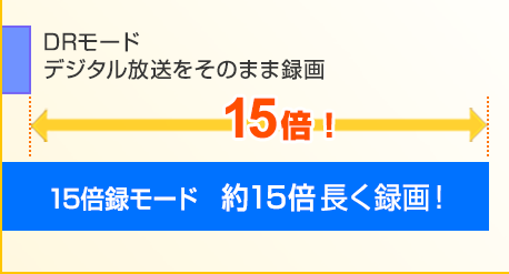 「15倍録モードなら」デジタル放送をそのまま録画した「DRモード」に比べ15倍の長時間録画が可能!