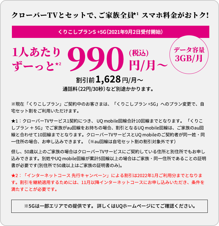 - 自宅セット割には「でんきコース」もございます。でんきコースの詳細についても、店頭スタッフまたはUQホームページでご確認ください。