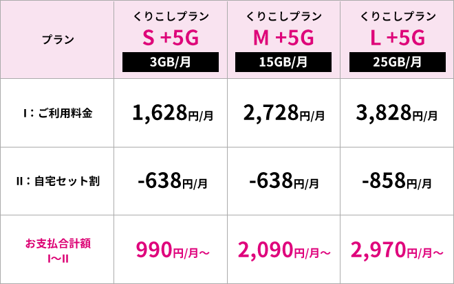 - ※ くりこしプラン+ 5Gは、スマートフォン(5G)向けプランです。スマートフォン(4G LTE)でもご契約できますが、その場合4G LTE通信でのご利用となります。